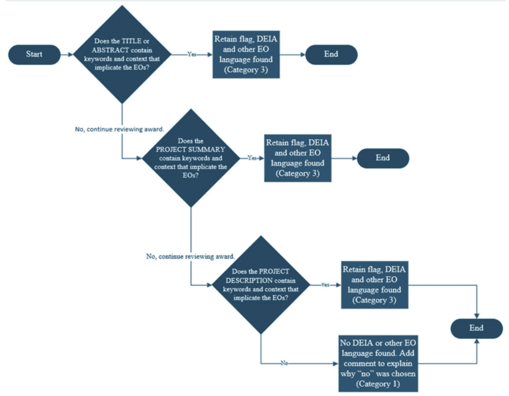 A leaked decision tree indicates that if flagged terms appear in a grant application, the NSF conducts a review to determine if the context violates the executive orders. On a broader scale, this means that organizations must now justify the inclusion of flagged terms to avoid funding rejection.